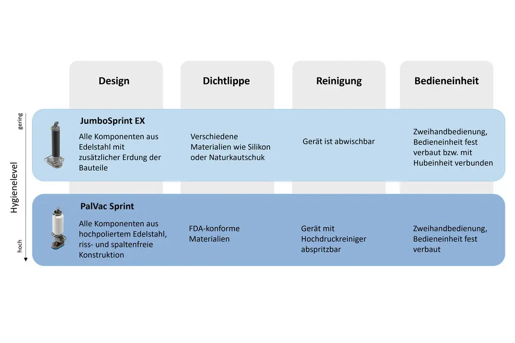 Angesichts der unterschiedlichen Anforderungen in Hygienebereichen wissen wir, dass passende Lösungen entscheidend sind. Daher haben wir unsere Vakuum-Schlauchheber in verschiedenen Ausführungen entwickelt. Unsere Produktübersicht ermöglicht es Ihnen, gezielt die Variante auszuwählen, die präzise auf Ihre hygienischen Anforderungen und spezifischen Funktionen zugeschnitten ist: