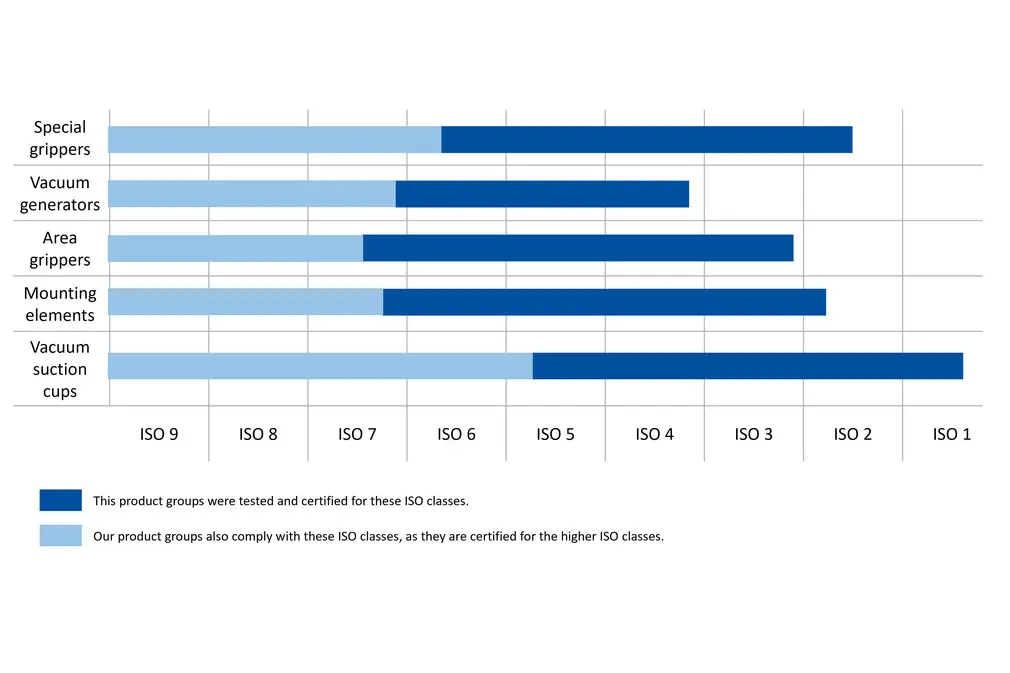 For better orientation, the following graphic shows the classification of our product portfolio based on the ISO classes and illustrates which solutions are suitable for your specific cleanroom requirements: