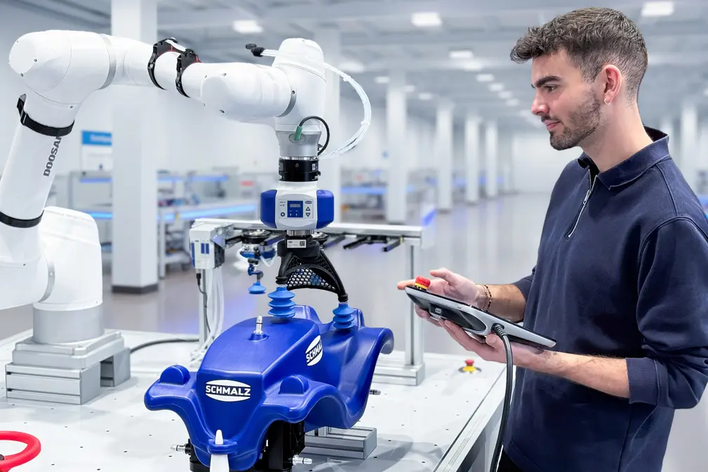 Dr. Maik Fiedler is a member of the company management and head of the Vacuum Automation business unit at Schmalz. In this interview, he explains the strategic importance of End of Arm Tooling (EOAT) for automation and describes how Schmalz designs the connection between robot and workpiece.